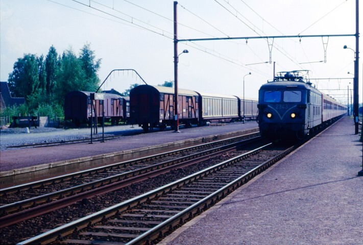 Een elektrische locomotief van de reeks 23 komt aan in station Lembeek. Zij sleept een reizigerstrein bestaande uit rode M 4-rijtuigen. Links staan enkele gesloten goederenwagens voor een laadprofiel. Hiermee werd in het verleden de hoogte en breedte van de lading van goederenwagens gecontroleerd. Station Lembeek ligt aan spoorlijn 96 (Brussel-Zuid - Bergen - Franse grens). Schenking van Myriam Hendrickx.