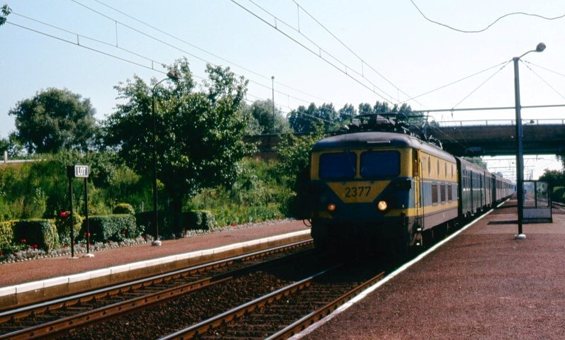 Een elektrische locomotief reeks 23 komt met een reizigerstrein samengesteld uit M 2-rijtuigen aan in het station. De perrons langs de sporen zijn goed zichtbaar, links staat een stationsnaambord en op het rechter perron een verlichtingspaal en een schuilhuisje. Schenking van Myriam Hendrickx.