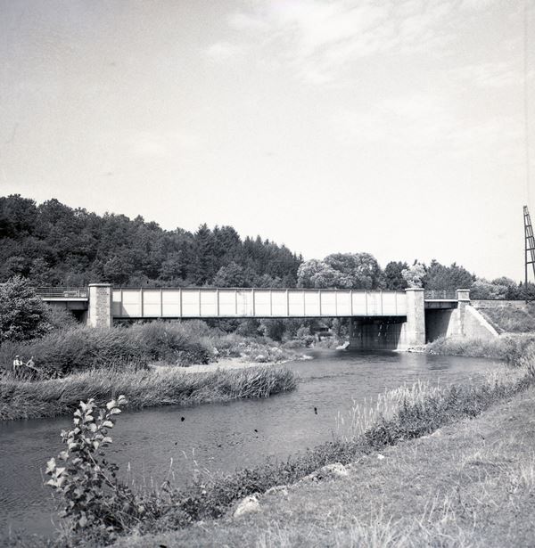 BeschrijvingDeze fotogroep bestaat uit vier negatieven. Ze tonen de nieuwe metalen brug over de Ourthe. Naast de spoorlijn staan telefoonpalen.