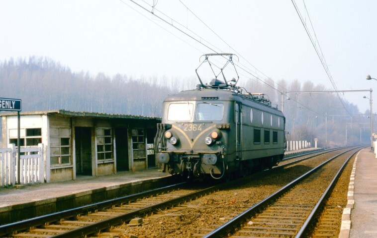 BeschrijvingEen elektrische locomotief reeks 23 rijdt door het station tijdens een losse rit. We zien de perrons, een stationsnaambord en een betonnen schuilhuisje.