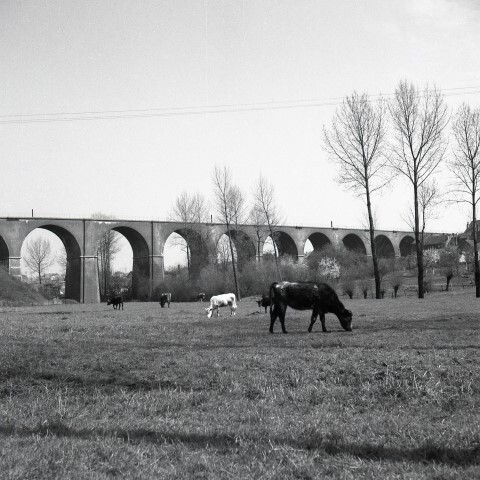 BeschrijvingDeze fotogroep bestaat uit drie negatieven. Ze tonen het bakstenen viaduct op de spoorlijn Eigenbrakel - Tubeke - Rognon (lijn 115) dat de vallei van de rivier Hain overspant.