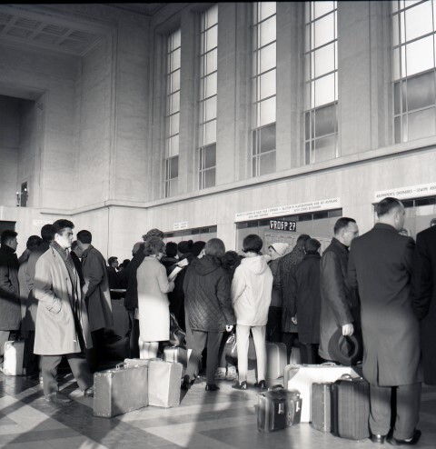 BeschrijvingDe foto toont wachtende reizigers met hun bagage in de enorme stationshal van station Brussel-Noord.