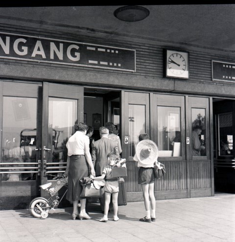 De foto toont dagjesmensen bij de ingang van het kopstation aan de kant van de sporen. Vooraleer ze de stationshal betreden, moeten ze hun vervoerbewijs tonen aan de kaartjesafnemer. Boven de ingang bevindt zich een luifel. Tegen de muur hangt een perronklok.