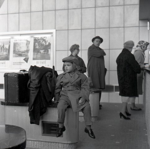 BeschrijvingDe foto toont aanschuivende reizigers bij de loketten. Een warm aangekleed jongetje zit op een verhoogje naast de bagage van zijn ouders. Tegen de muur hangen spoorwegaffiches.