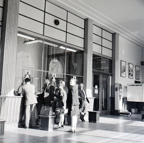 De foto toont aanschuivende reizigers bij de loketten. Rechts zien we dienstregelingsborden en een personenweegschaal. Tegen de muur hangen spoorwegaffiches.