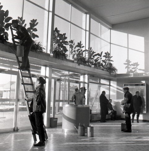 De foto toont twee personeelsleden die de beplanting boven de toegang tot de perrons water geven. Centraal zien we het hokje van de kaartjesafnemer. Tegen de muur hangt een treinaankondiger die nog manueel bediend wordt.