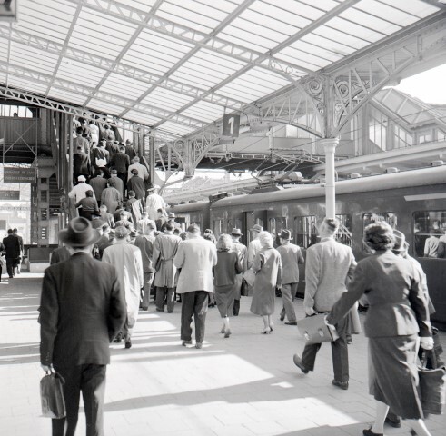 De foto toont reizigers die zich naar de uitgang haasten. De luifel van perron 1 is samengesteld uit glas en metaal en rust op gietijzeren kolommen. De perrons zijn met elkaar verbonden door een overdekte loopbrug met trappen. Naast het perron staat een elektrisch motorstel.
