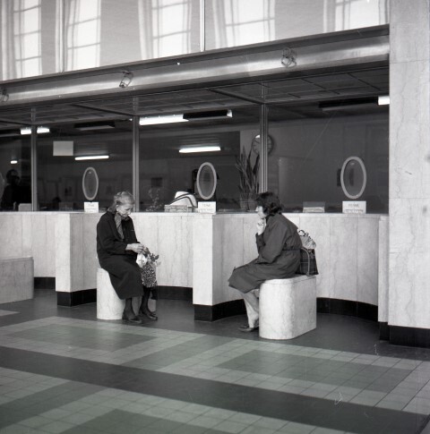 BeschrijvingTwee reizigers zitten voor de gesloten loketten. Achter het raam van het tweede loket zien we een Schustertoestel om spoorwegkaartjes te drukken.