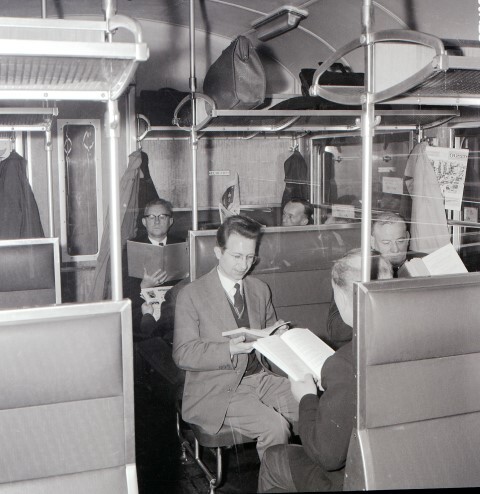 BeschrijvingDe foto toont het interieur van een motorrijtuig tweede klas. De reizigers zijn in hun lectuur verdiept.