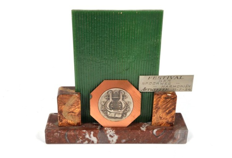 Groene stenen plaat in een marmeren staander. Erop een metalen plaatje met een lier en schrift. Daaronder een ander metalen plaatje met het opschrift 'Festival der Spoorweg - Harmoniën Antwerpen 11-7-54'.