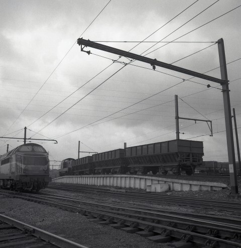 Links zien we een diesellocomotief van de reeks 51 in zijn oorspronkelijke livrei. Rechts duwt een rangeerlocomotief (vermoedelijk reeks 73) drie stortwagens voor ijzererts over een rangeerheuvel. Boven de sporen hangt een vereenvoudigde bovenleiding die uitsluitend voor lage snelheden geschikt is.