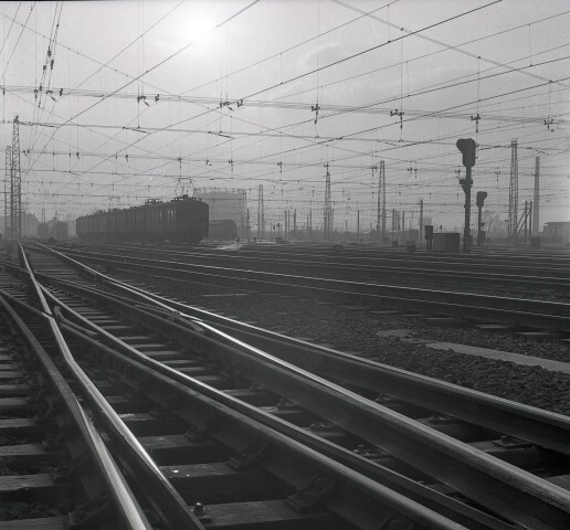 De foto toont in tegenlicht een trein, samengesteld uit motorstellen, die het station Brussel-Zuid binnenrijdt. Vooraan ligt een Engelse wissel. Door twee gewone wissels te combineren spaart deze in een sporenbundel ruimte uit. De bovenleiding is opgehangen aan draagkabels die tussen draagmasten opgespannen zijn. Met deze constructie wordt bij een ontsporing de beschadiging van de bovenleiding voorkomen.