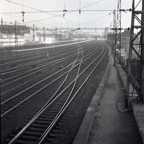 De foto toont de sporenbundel bij het binnenrijden van station Brussel-Noord. De bovenleiding is opgehangen aan draagkabels die tussen draagmasten opgespannen zijn. Met deze constructie wordt bij een ontsporing de beschadiging van de bovenleiding voorkomen. Vooraan ligt een gewone wissel die met meerdere Engelse wissels verbonden is. Een Engelse wissel combineert twee gewone wissels. Zo spaart men in een sporenbundel ruimte uit.