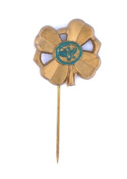 BeschrijvingDe kop van de speld bestaat uit een klavertje vier met in het midden een groen ovaal en een gevleugeld wiel.
