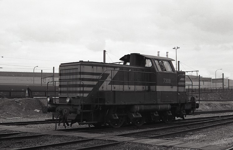 Deze locomotief behoort tot de reeks 73. De stenen muur rechts achter deze locomotief is de steunmuur van een rangeerheuvel. De goederenwagens worden over de heuvel geduwd om zo vaart te krijgen en op eigen kracht verder te rijden naar het vormingsstation (in het vakjargon heet dit 'heuvelen'). Op de voorgrond zien we een dienstweg over de sporen. Schenking van Myriam Hendrickx.