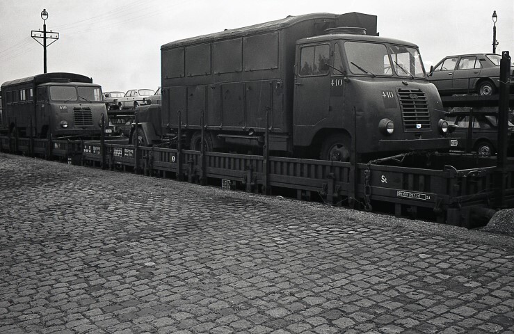 Deze fotogroep bestaat uit tien negatieven. De foto's A tot F tonen twee-assige platte wagens met rongen waarop legervrachtwagens staan opgesteld. Vermoedelijk gaat het om voertuigen van de transmissietroepen (TTR). Op de foto's G tot J zien we een platte wagen op draaistellen voor het transport van een metrorijtuig van de Maatschappij voor intercommunaal vervoer Brussel (MIVB).