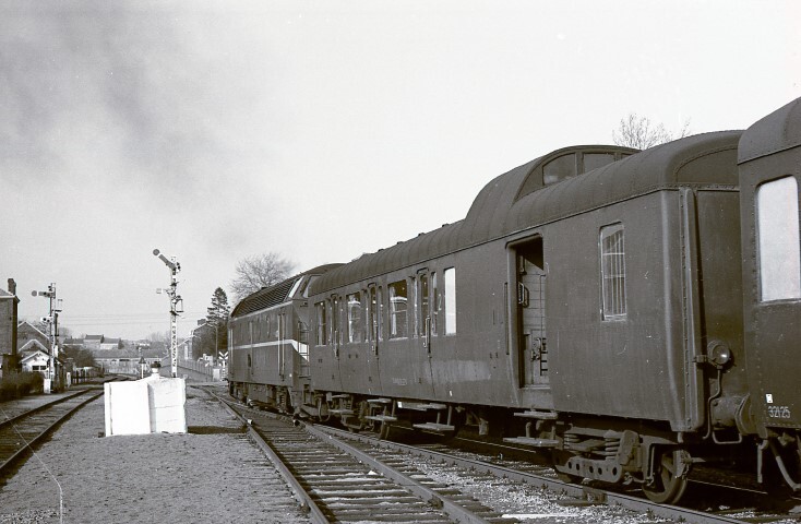 Dit L-rijtuig maakt deel uit van een reizigerstrein gesleept door diesellocomotief 6305. Het is een rijtuig BD (tweede klas en bagageruimte). De deur van de bagageafdeling staat open. Links zien we twee mechanische seinen van het tweestandenstelsel. De seinarm kon twee standen aannemen: 90° beval de trein te stoppen en 45° betekende dat de doorrit van de trein was toegestaan. Schenking van Myriam Hendrickx.