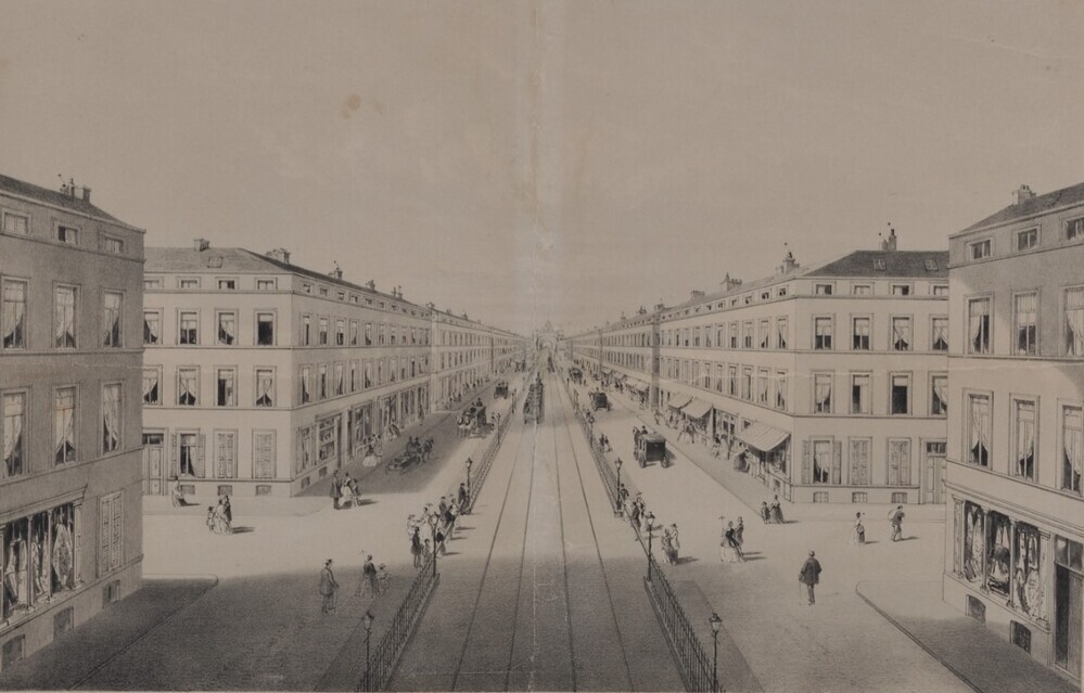 In 1841 werden in Brussel de noordlijn (die vertok uit Brussel-Groendreef) en de zuidlijn (die vertok uit het Bogaardenstation) voor het eerst met elkaar verbonden via een enkelspoor op straatniveau. Deze verbinding werd enkel gebruikt voor goederentransport en omwille van de veiligheid moest de trein steeds vooraf gegaan worden door een loper met een bel en rode vlag. Bij de bouw van de nieuwe stations Brussel-Noord en Brussel-Zuid zocht men naar een nieuwe oplossing. In de jaren 1850-'60 verschenen er verschillende voorstellen, o.a. voor verbindingen op straatniveau, via viaducten of ondergronds. Deze zwart-witprent toont een ontwerp van de architect Victor Besme, voor een Noord-Zuidverbinding op straatniveau.