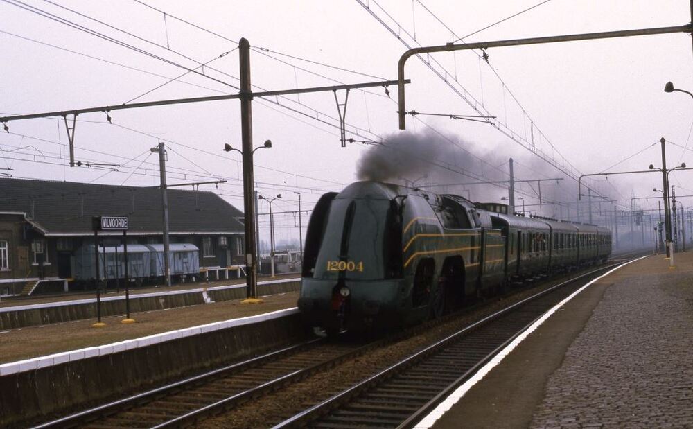 Deze fotogroep bevat 30 dia's. Op 11 mei 1985 reed stoomlocomotief 12.004 met vier L-rijtuigen op lijn 25 voor een historische rit tussen Brussel en Mechelen. De foto's werden genomen in Vilvoorde, Eppegem en Weerde. De eerste twee foto's tonen de trein in station Vilvoorde, de volgende beelden zijn genomen op volle baan. Schenking van Myriam Hendrickx.