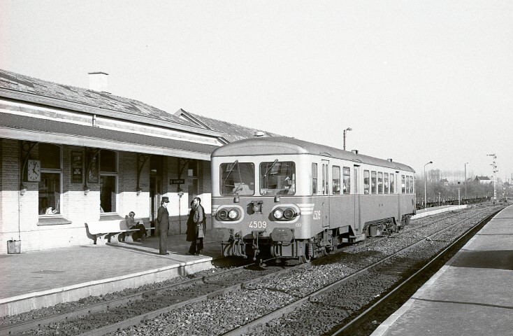 Deze motorwagen behoort tot de reeks 45. Links zijn een treinbegeleider en een machinist in gesprek met een reiziger. Ze staan op het perron dat grenst aan het stationsgebouw met luifel. Onder de luifel zien we een bank, een klok en enkele affiches. In de achtergrond staat een mechanisch sein. Schenking van Myriam Hendrickx.