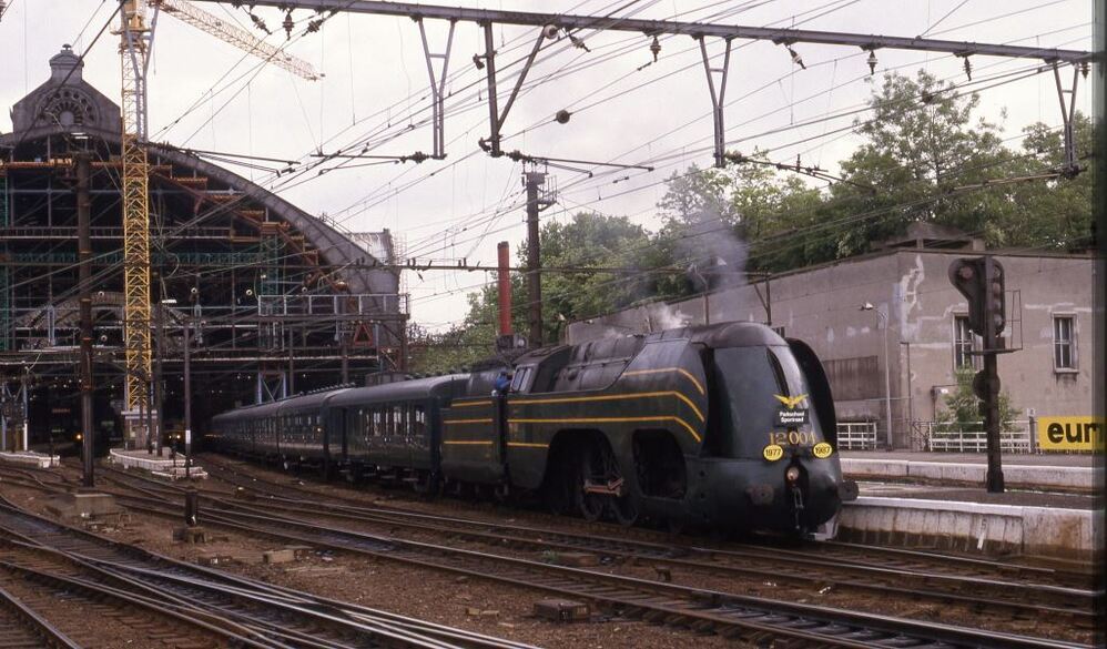 Deze fotogroep bevat 18 dia's. Op 7 juni 1987 reed stoomlocomotief 12.004 met zeven L-rijtuigen een historische rit op de spoorlijnen 12 en 25. De foto's werden genomen in het station Antwerpen-Centraal, Heide en Hove. Schenking van Myriam Hendrickx.