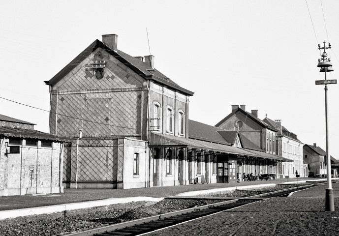 De foto toont het station met luifel aan de kant van de sporen. Links bevinden zich de toiletten. Op perron 2 staat een elektrische verlichtingspaal. Om het onverharde perron te bereiken, moeten de reizigers gebruik maken van een gelijkgrondse oversteek van de sporen.