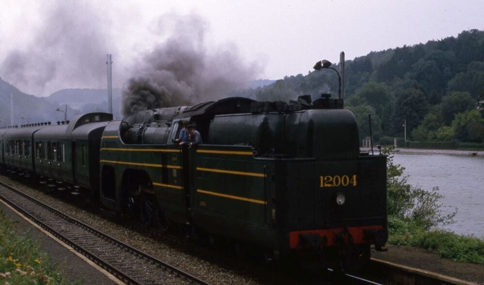 Stoomlocomotief 12.004 (type 12 - 2B1 Atlantic) sleept een toeristische excursietrein samengesteld uit L-rijtuigen. De gestroomlijnde locomotief is donkergroen geschilderd met gele sierstrepen. Ze sleept de trein met de tender vooraan. De trein is net aangekomen in het station Tailfer, we zien een deel van de perrons en de verlichting. De bovenleidingpalen voor de toekomstige elektrificatie zijn reeds geplaatst. Naast de spoorlijn stroomt de Maas. Schenking van Myriam Hendrickx.