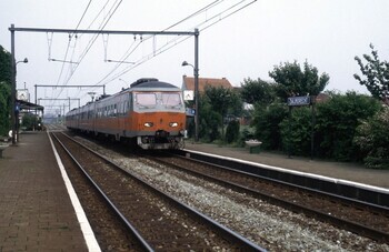 BeschrijvingEen vierledig motorstel reeks 800 is aangekomen in station Zwijndrecht. We zien de sporen, de bovenleiding, de perrons, een stationsnaambord en enkele stationsklokken. Uiterst links staat het dienstgebouw, geheel door klimop overwoekerd. De perronluifel is ook duidelijk zichtbaar.