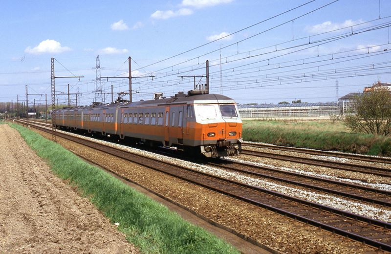 Deze fotogroep bevat twee dia's. Een vierledig motorstel reeks 800 rijdt op volle baan in de omgeving van Duffel. De tweede foto laat het stel zien op de spoorwegbrug over de Nete. Deze reeks motorstellen werd gebouwd door BN. ACEC leverde de elektrische onderdelen. Het motorstel bestaat uit een rijtuig AD (eerste klas en bagageruimte), en drie B-rijtuigen (tweede klas). De maximumsnelheid bedraagt 140 km/u. De oorspronkelijke kleurstelling is grijs/oranje. Naast de spoorlijn staan links nog bovenleidingspalen in vakwerk uit1935. Schenking van Myriam Hendrickx.