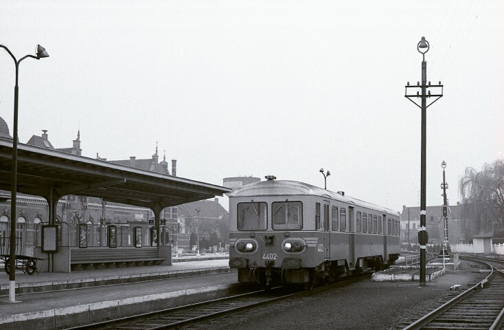 BeschrijvingDeze motorwagen behoort tot de reeks 44. Onder de perronluifel zien we lange zitbanken, enkele affiches en een bagagekar. Achter de luifel is nog net het stationsgebouw te zien.