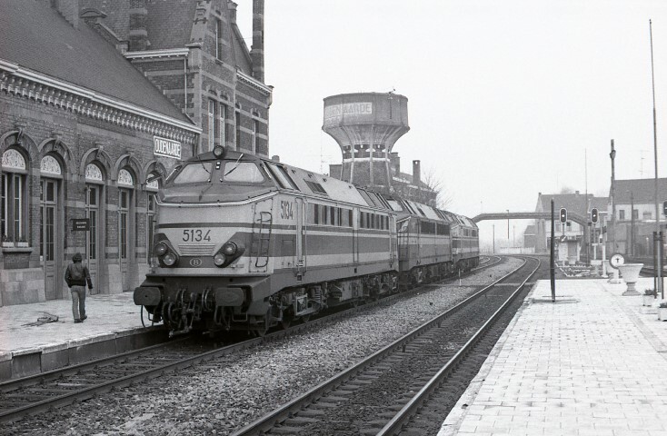 Deze locomotief behoort tot de reeks 51. Ze staat samen met twee locomotieven van dezelfde reeks aan het eerste perron in station Oudenaarde. Links zien we het stationsgebouw. Verderop staat een voormalige watertoren, een restant uit de stoomperiode. Op de achtergrond links bemerken we een voetgangersbrug. Schenking van Myriam Hendrickx.