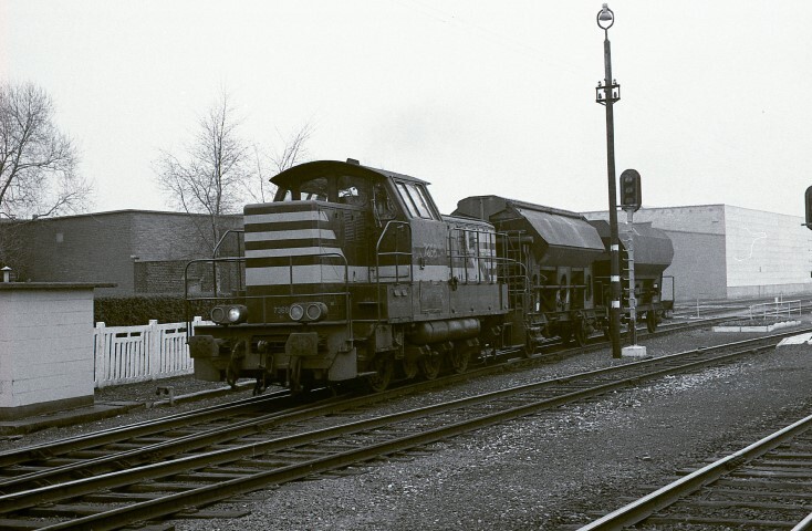 Deze locomotief behoort tot de reeks 73. Ze rangeert twee gesloten tremelwagens. Rechts zien we de achterzijde van een stopsein type I. Bemerk ook de houten lantaarnpaal vóór het stopsein.