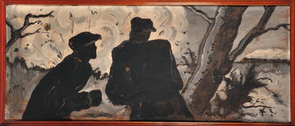 BeschrijvingSchilderij in donkere kleuren grijs, zwart en bruin. De twee mannen staan op de voorgrond. Ze verbergen zich achter een boom terwijl in de verte een spoor ontploft, net wanneer een stoomtrein komt aanrijden.