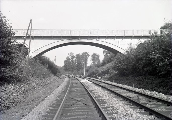 De foto toont een brug over spoorlijn 26 (Schaarbeek - Halle). Langs de spoorlijn staan telefoon- en telegraafmasten. Rechts zien we een mechanisch sein. Om de stabiliteit van de sporen te verzekeren, werden de dwarsliggers kruiselings met metalen platen verbonden.