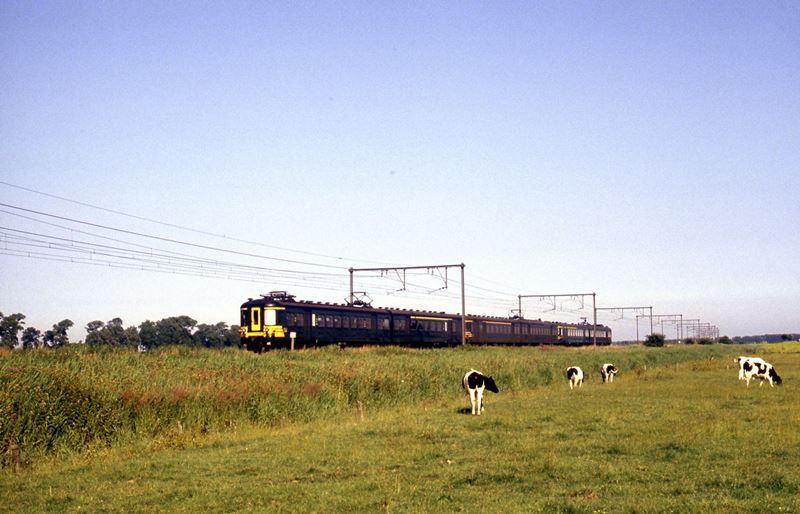 Een reizigerstrein met vooraan motorstel 531, gekoppeld aan de stellen 535 en 676, rijdt in de buurt van Zandvoorde. Motorstel 531 behoort tot reeks 00, schijf 1955.
