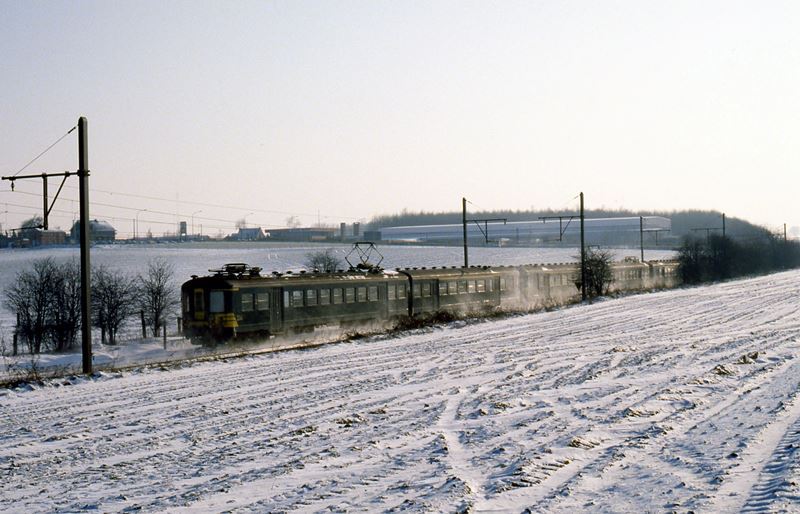 Een reizigerstrein met vooraan elektrisch motorstel 534, gekoppeld aan de stellen 521 en 530, rijdt door een winters landschap in de buurt van Lillois. Motorstel 534 behoort tot reeks 00, schijf 1955.