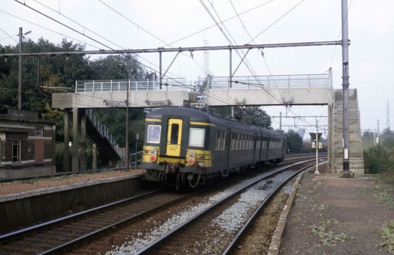 Motorstel 647 (reeks 05, schijf 1970) rijdt station La Chaussée (nabij Luttre) binnen. Een voetgangersbrug loopt over de sporen. Dit station ligt langs spoorlijn 124A (Luttre - Charleroi).