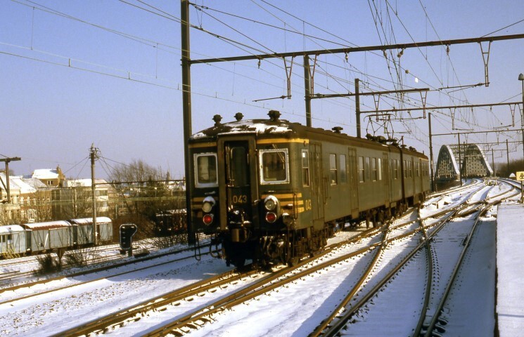 Deze fotogroep bevat twee dia's. In winterse weersomstandigheden zien we een elektrisch motorstel reeks 00, schijf 1953 het station binnenrijden. Links staan enkele werfwagens op de lager gelegen sporen. We zien ook een lichtsein en op de achtergrond is de metalen spoorwegbrug zichtbaar. Schenking van Myriam Hendrickx.