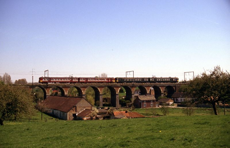 Deze fotogroep bevat twee dia's, genomen ter hoogte van het spoorwegviaduct in Ecaussinnes. Een reizigerstrein met tweeledige motorstellen 660 en 734 rijdt over het viaduct. Het eerste stel behoort tot reeks 05, schijf 1970 JH, het tweede tot reeks 06, schijf 1978. We zien beide stellen in een verschillende kleurstelling: bordeaux met een witte en gele band / groen met gele zichtbaarheidsstrepen. Schenking van Myriam Hendrickx.
