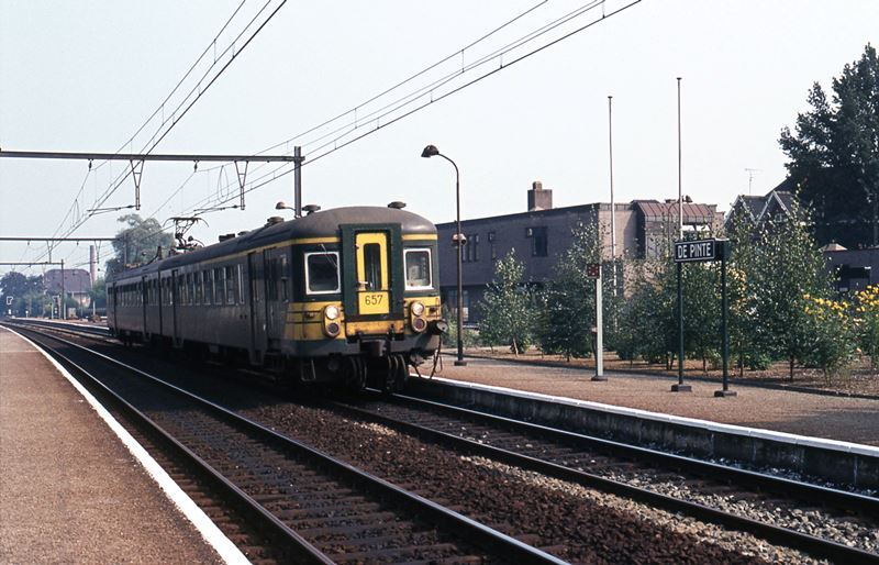 Motorstel 657 staat aan het perron in station De Pinte. Dit stel behoort tot reeks 05, schijf 1970 JH. Op het perron zien we een stationsnaambord en perronverlichting. De Pinte ligt langs spoorlijn 86 (Gent-Sint-Pieters - Ronse). Schenking van Myriam Hendrickx.