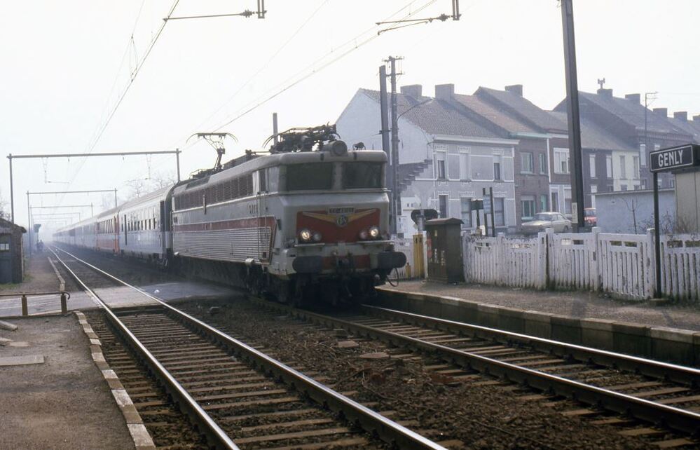 Elektrische locomotief cc40101 van de 'Société nationale des chemins de fer français' (SNCF) sleept een internationale trein voorbij station Genly. De trein kruist een overweg, gelegen juist voor de perrons met naambord en perronverlichting. Deze vierspannige locomotieven voor het slepen van internationale treinen zijn vrijwel identiek aan de Belgische reeks 18. Genly, een deelgemeente van Quévy, ligt langs spoorlijn 96 (Brussel-Zuid - Quévy - Franse grens). Schenking van Myriam Hendrickx.