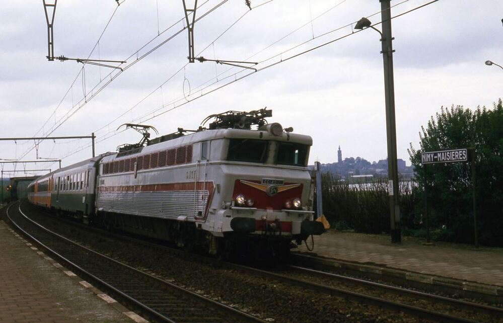 Elektrische locomotief cc40101 van de 'Société nationale des chemins de fer français' (SNCF) sleept een internationale trein voorbij station Nimy-Maisieres. Op het perron staat een naambord en perronverlichting. Deze vierspannige locomotieven voor het slepen van internationale treinen zijn vrijwel identiek aan de Belgische reeks 18. Station Nimy-Maisières ligt langs spoorlijn 118 (Bergen - La Louvière-Centrum). Schenking van Myriam Hendrickx.