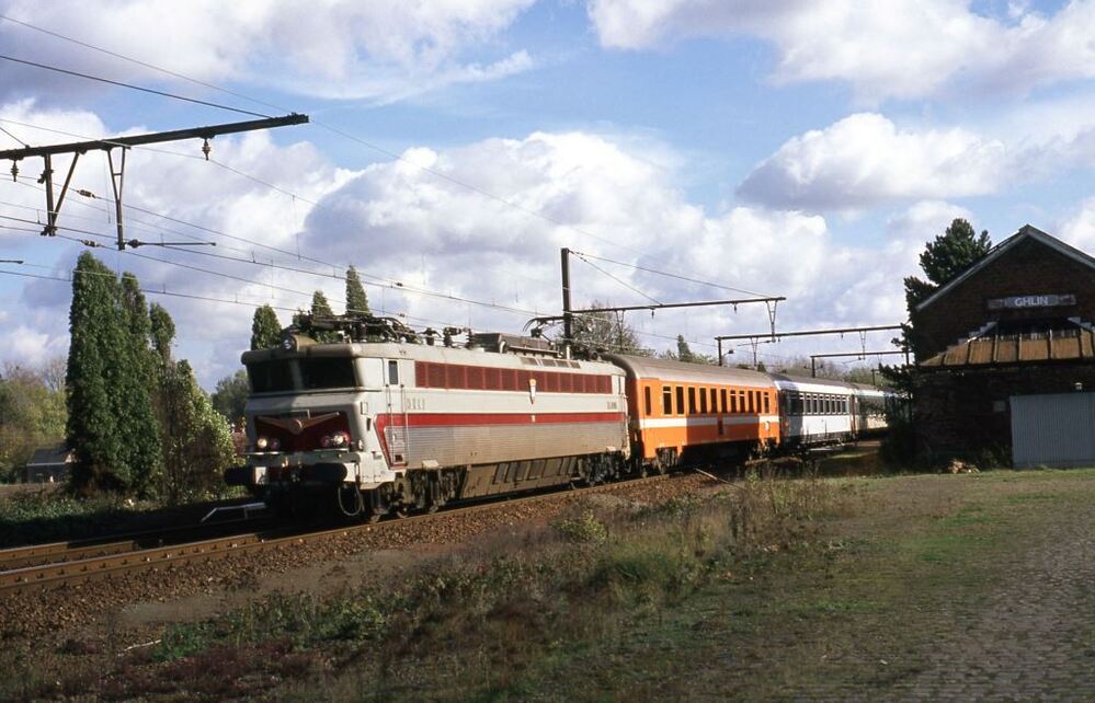 Elektrische locomotief cc40105 van de 'Société nationale des chemins de fer français' (SNCF) sleept een internationale trein voorbij station Ghlin. Rechts zien we nog een gedeelte van het stationsgebouw met op de zijgevel het opschrift 'Ghlin'. Dit station ligt langs spoorlijn 96 (Brussel-Zuid - Quévy - Franse grens). Schenking van Myriam Hendrickx.