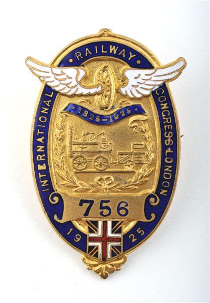 Ovale gekleurde pin. In het veld één van de eerste stoomlocomotieven met daarboven in een blauwe band de data 1825-1925. Daarboven een gevleugeld wiel. Onder de afbeelding een band met het nummer 756 en daaronder de Engelse vlag. De omtrek is blauw en bevat de inscriptie 'International Railway Congress London 1925'. Schenking van dhr. Ghilain.