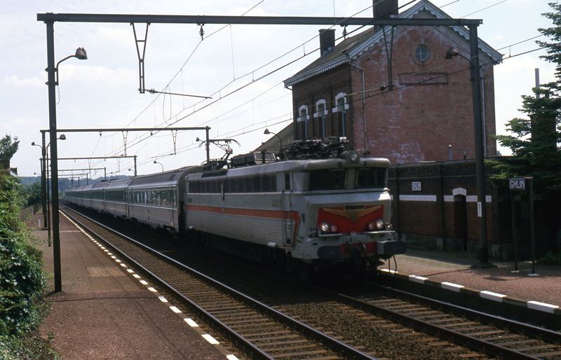 Elektrische locomotief cc40105 van de 'Société nationale des chemins de fer français' (SNCF) sleept een internationale trein voorbij station Ghlin. Rechts zien we het stationsgebouw en een stationsnaambord op het perron. Station Ghlin ligt langs spoorlijn 96 (Brussel-Zuid - Quévy - Franse grens). Schenking van Myriam Hendrickx.