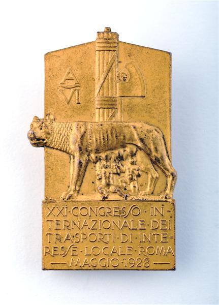 Rechthoekige knoop met in het veld de wolvin die Romulus en Remus voedt. Rechtsboven 'A/VI' (zesde jaar van het fascistische tijdperk). Onder de wolvin de naam van de originele kunstenaar 'Jacobvcci'. In de afsnede 'XXI Congresso Internazionale dei Trasporti di Interesse Locale Roma Maggio 1928'. Schenking van dhr. Belpaire.