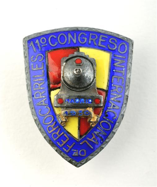Gekleurde knoop in de vorm van een schild. In het veld een locomotief in vooraanzicht tegen een rood-gele achtergrond. Tussen de bufferschijven staat 'Madrid 1930'. De omtrek is blauw met als opschrift '11° Congreso Internacional de Ferrocarriles'. Schenking van dhr. Ghilain.