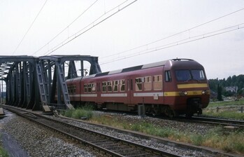 BeschrijvingTweeledig motorstel 384 (reeks 03, schijf 1983 'Break') rijdt over een metalen spoorbrug.