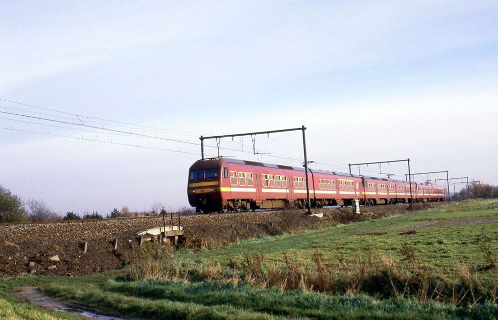 BeschrijvingDrie elektrische motorstellen reeks 03 (Break) vormen samen een reizigerstrein. De trein rijdt door een landelijke omgeving.