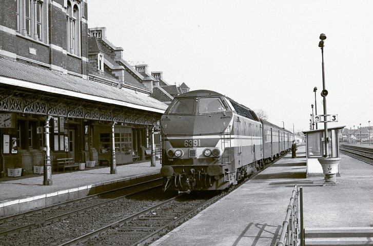 Deze locomotief behoort tot de reeks 63. Ze staat met enkele M 3-rijtuigen aan het perron. Links zien we het stationsgebouw met aangebouwde luifel. Op het perron rechts zien we een schuilhuisje en een grote ronde betonnen bloempot. Schenking van Myriam Hendrickx.